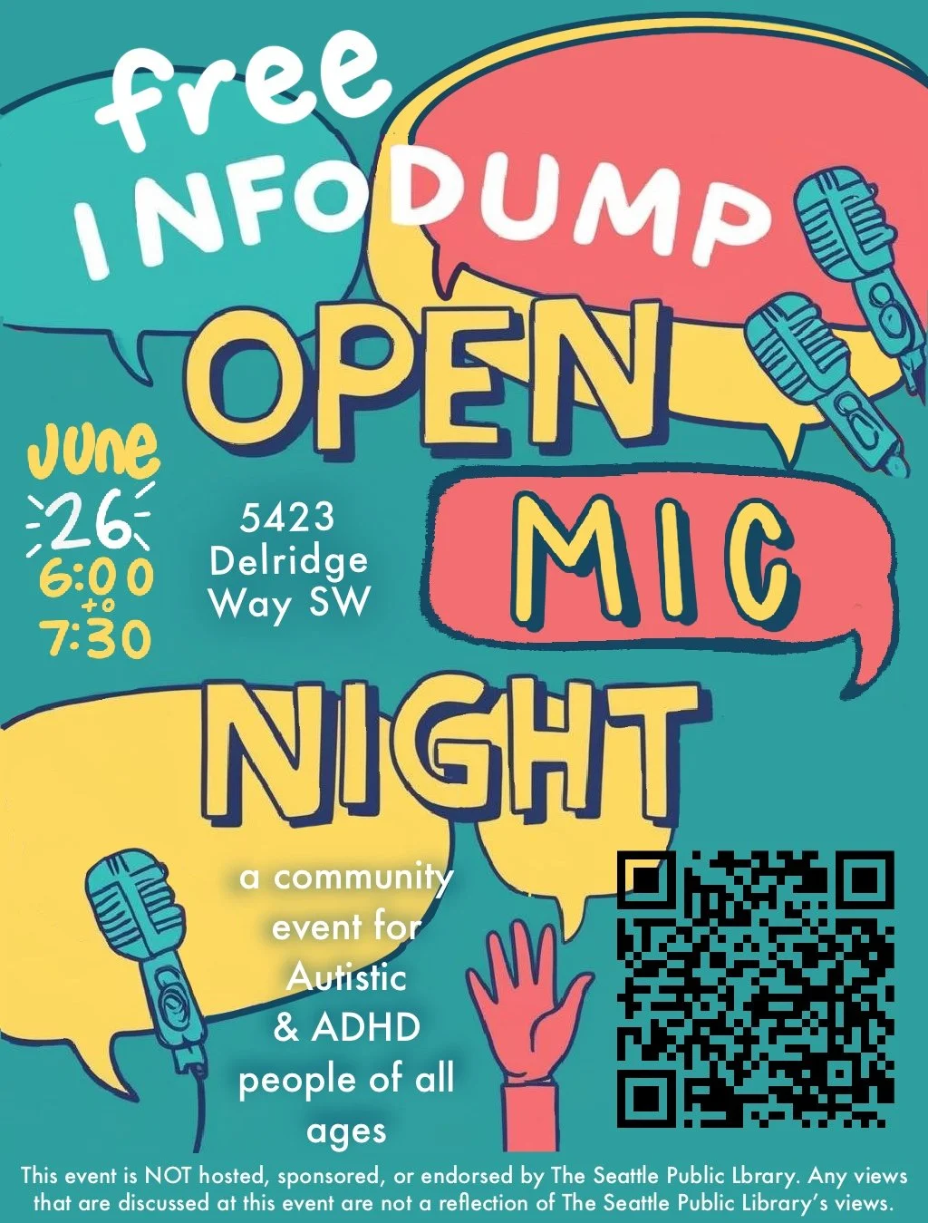 The event is 1.5 hours long. In the first hour, five people get seven minutes each to infodump about their special interests and/or hyper-fixations. People can come to share or simply enjoy listening to others. Past topics have included organ and tissue donation, Postcrossing, literal rocket science and so much more. There’s usually some time for Q&A, and the last 30 minutes are an optional time to socialize and share more about your favorite topics.